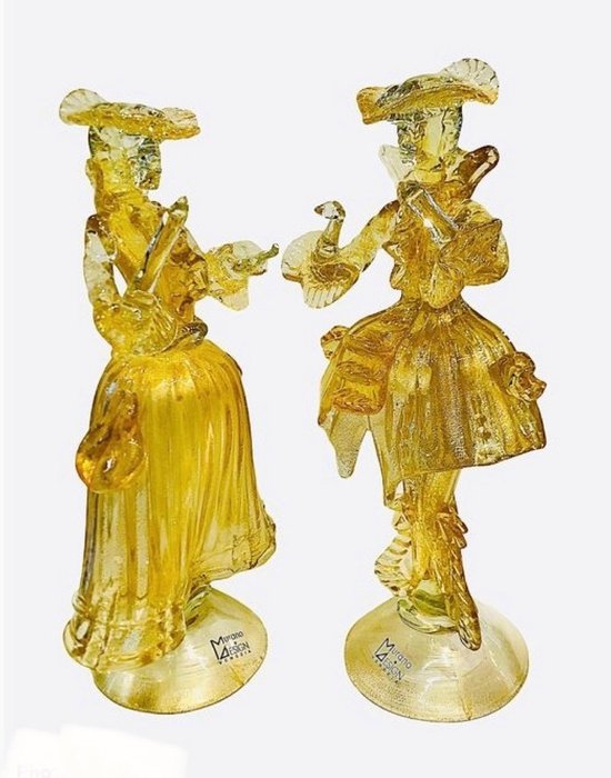 Paar Goldonische beeldjes gemaakt door meester Filippo Maso met de geblazen glastechniek met toevoeging van 24 Kt bladgoud in zijn oven