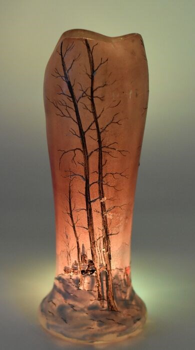 Balustervaas met inspringende klaverhals, genaamd "Belgrado", met oranje gemarmerde achtergrond omzoomd met beige, geëmailleerde decoratie van besneeuwd en geanimeerd landschap. Legras, Art Nouveau periode rond 1900.