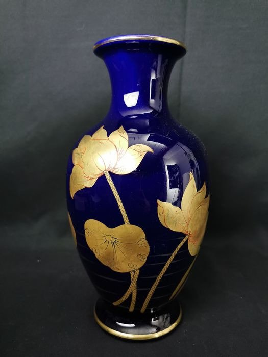 Deze grote vaas is handgemaakt van porselein en is beschilderd en ingelegd met prachtige verfijnde, puur gouden versieringen in de vorm van lelies en leliebladeren. De typische kobalt blauwe kleur van deze vaas van Asch staat bekend als ‘bleu de Tours’ en is aangebracht door middel van email.