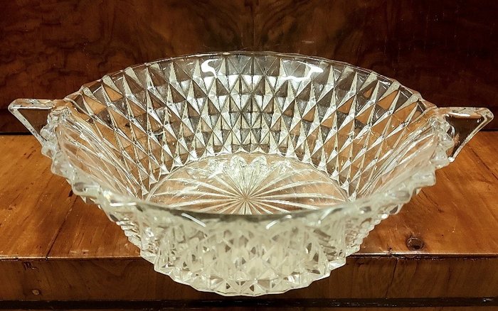 Fruitsalade servies bestaande uit 1 terrine en 8 kopjes, half kristal, Frankrijk, jaren 50. Perfect bewaard gebleven, volgens mij nooit gebruikt.