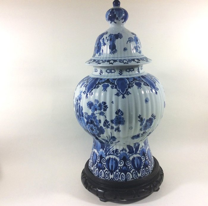 Porceleyne Fles: zeer fraaie, in diep blauw tinten, geribbelde deksel vaas met decoratie pauw & florale motieven.