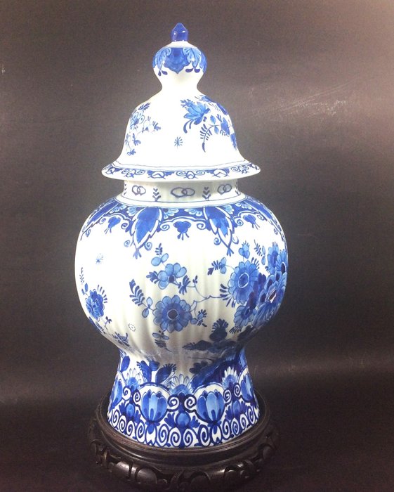 Porceleyne Fles: zeer fraaie, in diep blauw tinten, geribbelde deksel vaas met decoratie pauw & florale motieven.