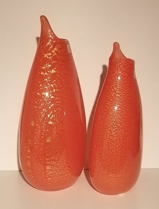 Uiterst fraaie rode vazen van glaskunstenaar Germano Padoan, geblazen in de glasstudio van Gränna Glasbruk Zweden.