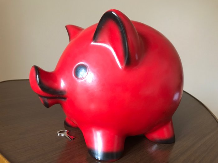 Dit grote aardewerken varken is rond de jaren 60-70 gemaakt door de iconische West-Duitse fabrikant Goebel in Duitsland. Het originele slot en sleutel werken zeer goed. De markering luidt: SD 45 Goebel.