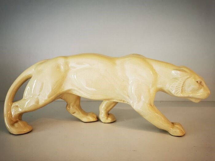Very beautiful large Art Deco panther sculpture, in glazed white cream earthenware This is probably a very rare piece from the St Clément factory from the 1940s. The piece is approx. 47 cm long, 18 cm high and is in good condition. See photos for its beauty and condition.