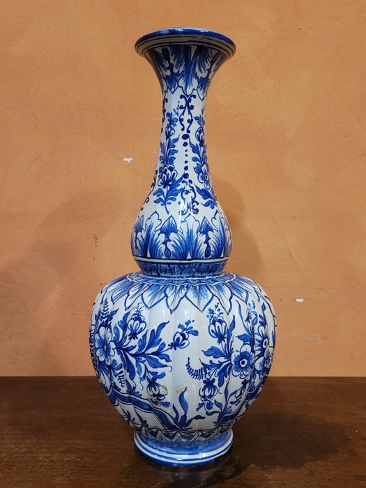 Witte keramieken vaas met blauwe motieven van Gualdo Tadino uit de eerste helft van de 20e eeuw met reigers.
