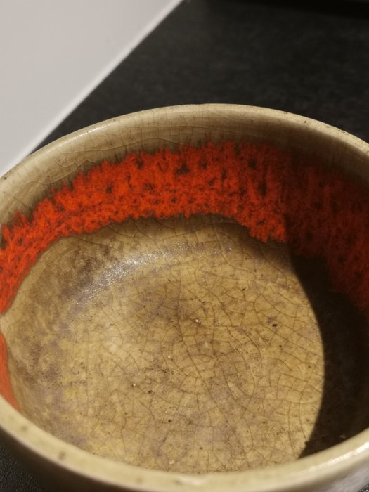 Prachtige keramieken schaal van Guido Gambone met bruin en rood/oranje vulcano glazuur.