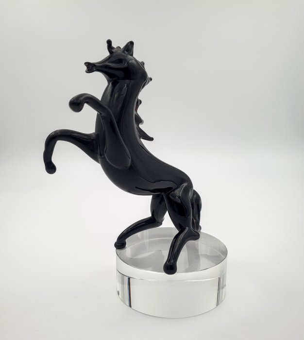 Het Murano-glassculptuur van het steigerende paard, gemaakt door meester-glasmaker Roberto Guidotti, is een kunstwerk dat de schoonheid en harmonie van vormen combineert met de beheersing van de lampwork-glastechniek. Het beeld stelt een steigerend zwart paard voor, met details die zijn kracht en energie versterken, zoals de warrige manen en rechtopstaande staart. Het zwarte Murano-glas dat voor de sculptuur is gebruikt, geeft de figuur een noot van mysterie en elegantie en reflecteert het licht op een onverwachte en verrassende manier. De lampwork-glastechniek, waarbij een gastoorts wordt gebruikt om het glas te vormen, heeft Maestro Guidotti in staat gesteld een uniek beeld te creëren.