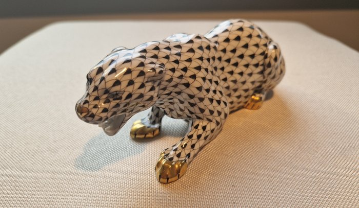 Herend - Vieux porseleinen beeldje van een panter, zwart-wit visnetstijl, 24K goud beschilderd. Uitstekende staat.