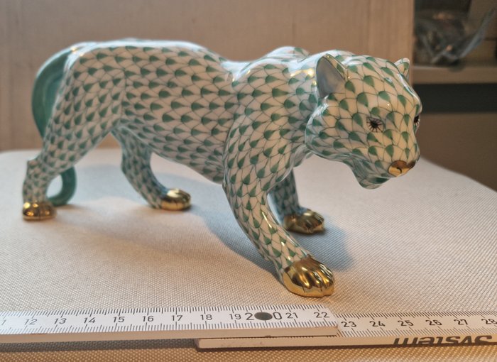 Herend - Vieux porseleinen beeldje van een tijger, groen-witte visnetstijl, 24K goud beschilderd. Uitstekende staat.