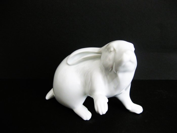 Zeer mooi porseleinen Herend beeldje van een wit konijn en 2 eivormige snuisterijdoosjes.