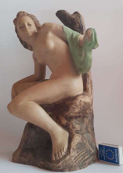 Prachtig groot terracotta Art Nouveau-stijl naakte vrouw, beeld van de bekende Hongaarse beeldhouwer Imre Kovács Turáni, in goede staat, met slijtage aan het oppervlak voor zijn leeftijd, zie foto's.