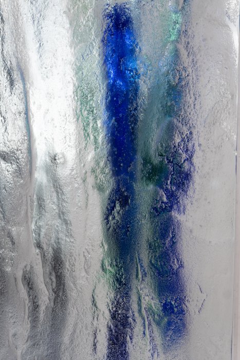 Onregelmatige organische vorm. Gemaakt van kleurloos loodkristalglas, gedeeltelijk geslepen. De vaas toont zes langwerpige objecten in groen- en blauwtinten die de trechtervormige opening omringen. Sommige delen van de vaas zijn ongesneden gelaten. Prachtig kleurenspel en mooie optische effecten - vooral met een passende verlichting. Zeer decoratieve blikvanger! Vrij massief en zwaar.