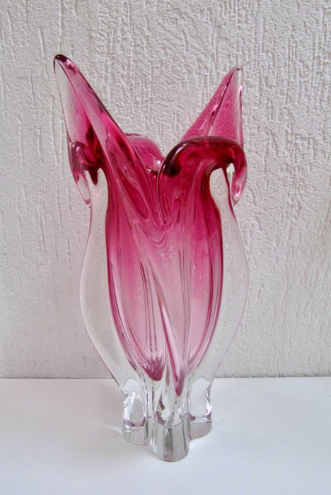 Deze grote vaas van zware kwaliteit is gemaakt in Tsjecho-Slowakije door Josef Hospodka voor Chribska Glass Factory. De kleurstelling is verbluffend, helder glas Sommerso omlijsting en onderstel gaan samen met briljante fuchsia tinten, waardoor een verrassend effect ontstaat. Met een beetje fantasie zie je in de contouren van het ontwerp een figuur die veel weg heeft van een dier (Uil, Aap?) en van opzij gezien .... een perfecte muis! Bedoeld of niet, dit Hospodka-ontwerp bevat steevast fantasierijke dierfiguren, elk stuk is anders en daarom uniek.