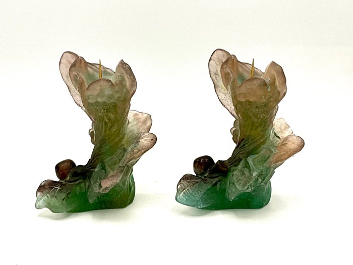 Paar kandelaars in roze en groen glaspasta … afbeelding van een slak op gebladerte … Gesigneerd DAUM onder de voet … klein chipje op een van de 2 kandelaars (zie foto)