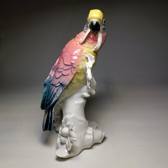 Prachtige art deco porseleinen papegaai - kaketoe - met roze, blauwe, gele kleuren, gemaakt door Karl Ens Volkstedt, Duitsland.