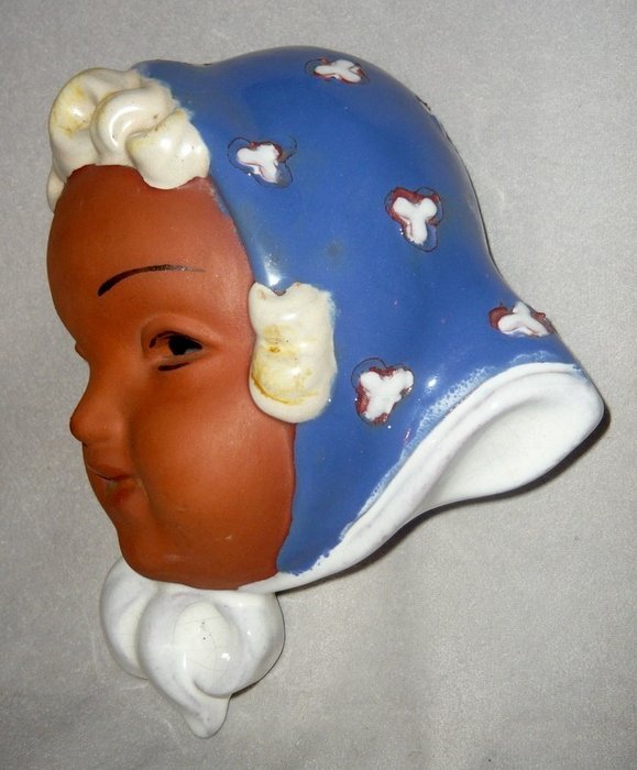 Prachtig Art Deco muusmaker met voorstelling van een kinderhoofdje met muts (model 1006). Ontwerp van Karl Grossl, uitgevoerd in de bij ons iets minder gekende fabriek van Keramia in Tsjechoslovakije. Terracotta aardewerk met rode scherf polychroom geglazuurd. Gemerkt om de achterzijde met het modelnummer 1006, het ingedrukte logo van de fabriek en "made in Czechoslovakia".