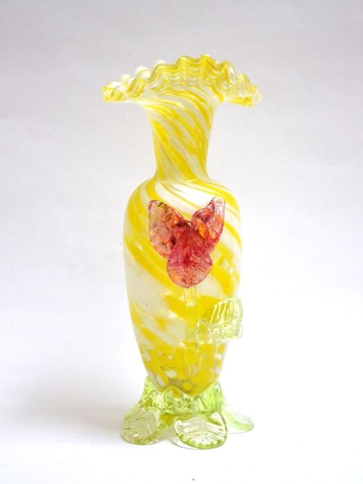 Glazen vaas met aangebrachte bloemendecoraties en voet van uraniumglas. Karolininu hut, Harrachov, Bohemen, circa 1890. 18,9 cm hoog. Niet gesigneerd noch gemerkt.