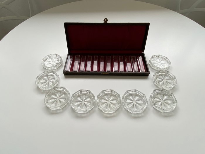 Zeldzame kristallen messenleggers met schitterende gravures . En 9 prachtige onderzetters.