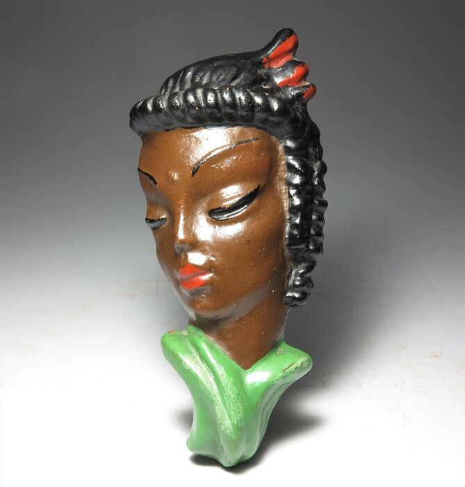 Prachtig klein art deco terracotta, keramisch wandmasker van de Kory Ceramics Manufactory (Hongarije).
