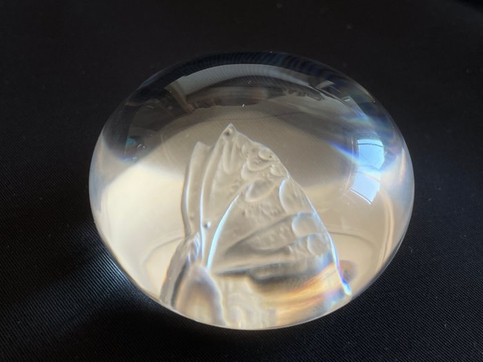 Lalique vintage collection presse-papier, een zeldzame versie met een gebeeldhouwde satijnen fee in bas-reliëf op de basis van het stuk. De koepelvormige structuur combineert met dit detail en creëert een caleidoscopisch effect waardoor de vorm varieert en zelfs verdwijnt, afhankelijk van de lichtinval die erop valt.