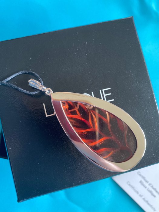 Heliconia lange halskettinghanger in gegoten geperst kristalpasta met plantendecoratie gesloten door een 925 ‰ zilveren montuur gemaakt door Lalique in Frankrijk.