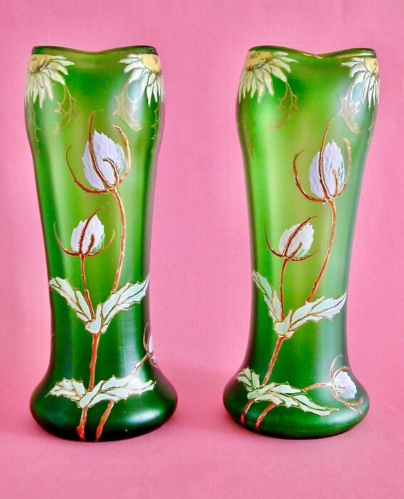 Gemaakt door de 'Cristallerie de Pantin' (Montjoye) voor 'Legras', deze pure Art Nouveau vazen zijn een absoluut genot om te zien en te bewonderen. Uit mijn persoonlijke collectie, ze zijn altijd goed verzorgd en ik kan met trots zeggen dat ze in 100% perfecte staat verkeren! De bloememail is dik en prachtig aangebracht, evenals de vergulde bladeren, waardoor het geheel gracieus afsteekt tegen het smaragdgroen getinte glas. Uiteraard is alles met de hand beschilderd. Er is een beetje verguld slijtage, maar alleen op de rand als gevolg van gebruik. Perfect groot geslepen Pontil-merkteken, laat zien dat deze vazen met de mond zijn geblazen en niet met de mal zijn geblazen. Al met al prachtige verzamelvazen! Maat: Ca. 23 cm. H x 9 cm. W. Elk.