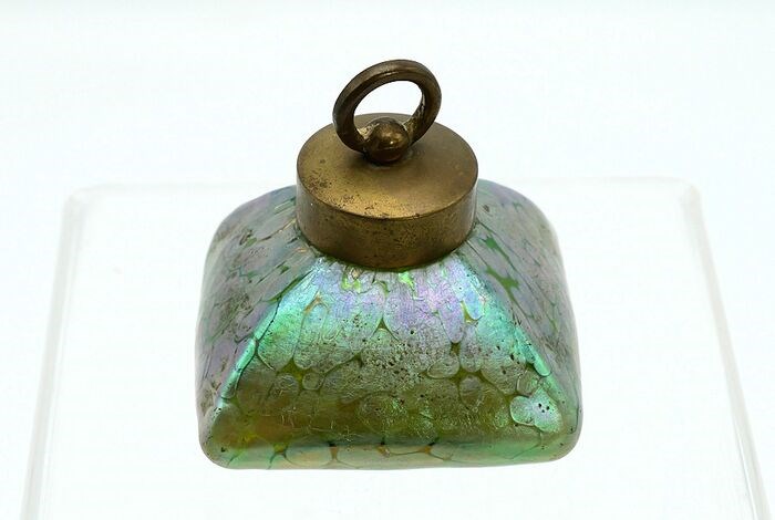 Een zeldzame miniatuur inktpot van Loetz ? glas met messing deksel