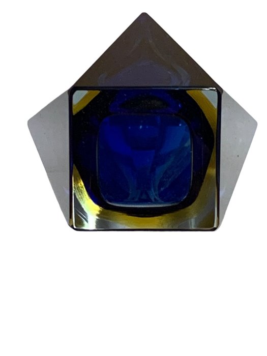 Vaas in halverwege de eeuw geproduceerd door de Mandruzzato-familie van glasmeesters in gefacetteerd glas ondergedompeld in drie lagen.; het kobaltblauwe centrum is verpakt in een laag geel glas dat op zijn beurt zachtjes vervaagt naar de dikke buitenlaag van helder glas. In uitstekende staat, met de originele sticker van de fabrikant zoals te zien op de foto's. Gemaakt in Murano, Italië.