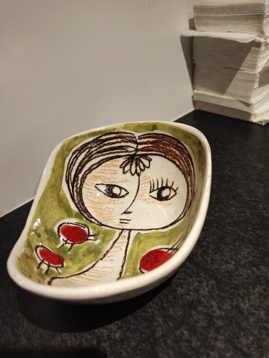 Deze elegante schaal is gedecoreerd door de meester van de keramische kunst en stelt een jong meisje voor in een modern ontwerp uit het midden van de eeuw met een diep geglazuurde achtergrond ingesneden en versierd met glanzende heldere glazuren in de kleuren groen, aardebruin en rood lava.