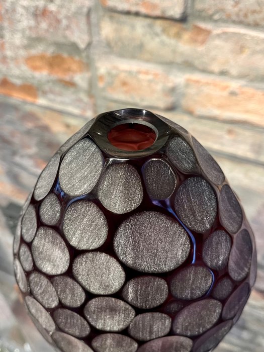 De vaas is eerst gemaakt in de oven met de techniek van geblazen glas en daarna is hij door ons volledig met de hand gegraveerd met diamantwielen met een cirkelpatroon.