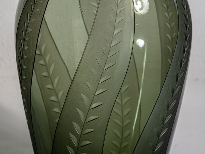Perfect afgeronde vorm. Gerookt glas in antraciettinten met duidelijke groene tonen. Prachtig gesatineerd gedraaid patroon met