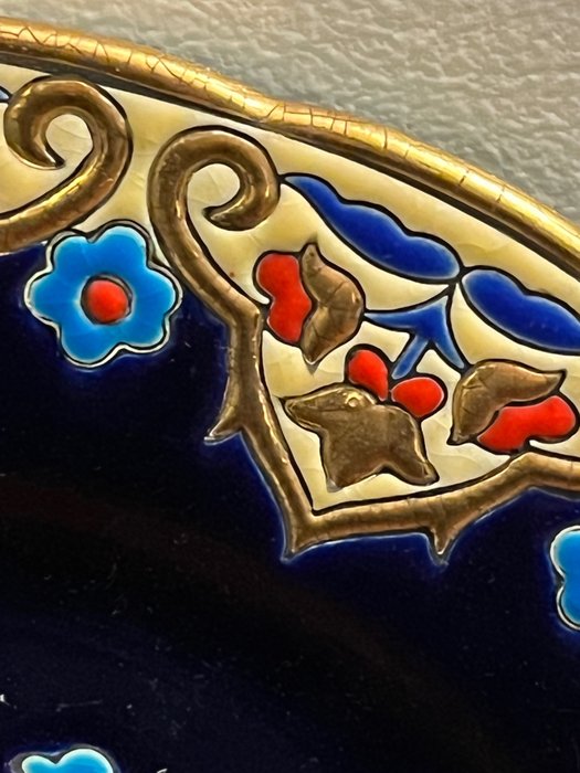 De kleuren zijn oogverblindend, kobaltblauw genaamd "oven", gouden interliniëring waarin turquoise en rode cabochons verschijnen, armenvol bloemen uit de karakteristieke velden van Lotharingen, land bij uitstek voor de keramische fabrieken die Longwy's reputatie in de hele wereld hebben gemaakt met de emailtechniek genaamd "cloisonnés".