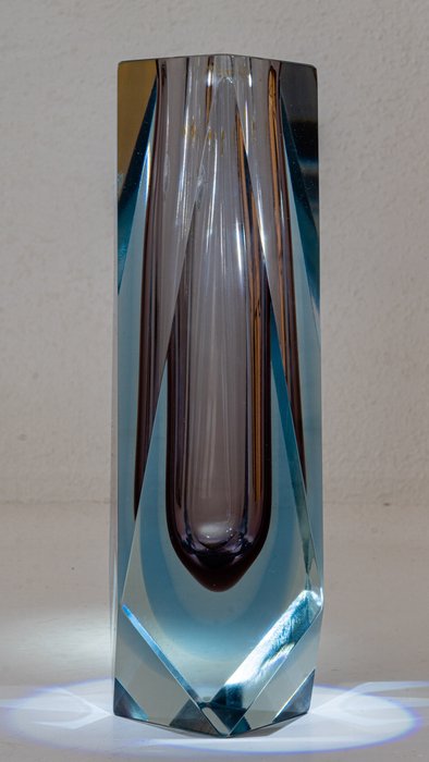 Gefacetteerde klassieke vorm. Lagen in de kleuren lichtaubergine en lichtblauw, gevat in helder kleurloos glas. Prachtig kleurenspel en prachtige optische effecten - vooral met een passende verlichting.