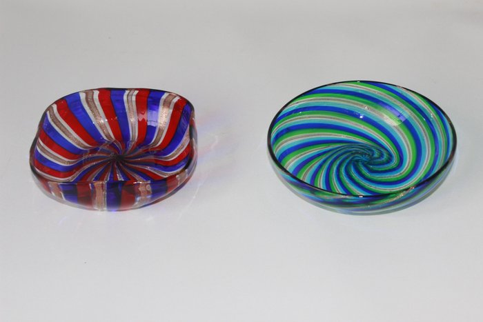2 kleurrijke murano glazen kommen in puntgave conditie. Ze zijn gedecoreerd met gekleurde slierten en een soort goudstof. De kom met rood is vierkant van vorm met afgeronde hoeken, deze is 3,5 cm hoog, 11 breed en lang en 11.7 cm diagonaal. Het ronde kommetje is 3.1 cm hoog en heeft een diameter van 11.5 cm. Ze zijn uit de jaren 60 van de 20e eeuw.