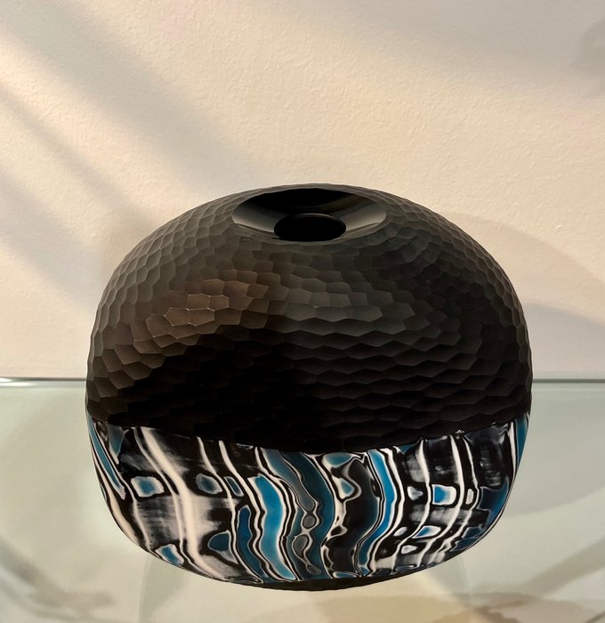 Deze vaas gemaakt met de blaastechniek is volledig met de hand gegraveerd om alle kleuren binnen de band van murrine naar voren te brengen.