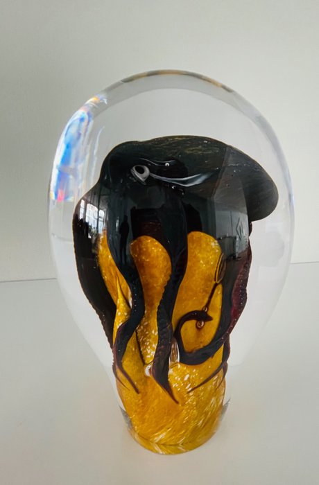Mondgeblazen en handgevormd, helder kristal met goudgeel glazen kern en prachtig ingesloten octopus.