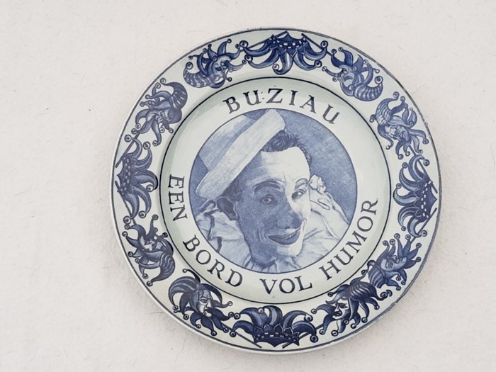 Met de tekst " Een bord vol humor " en met een afbeelding van de Nederlandse clown Buziau.