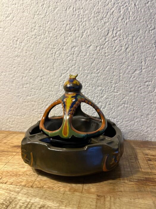 Mooie en zeldzame asbak gemaakt door de Zuid-Holland fabriek te Gouda omstreeks 1920/1930 in opdracht voor het Nederlandse sigaretten bedrijf Turmac wat gevestigd was in Zevenaar van 1920/2007