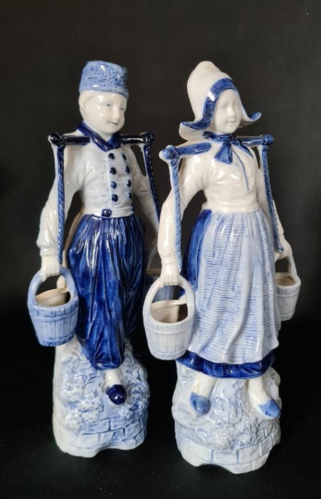 Twee grote Delftsblauwe beelden in hun soort, de vrouw is 23 cm hoog en de man is 23.5 cm hoog, gemaakt van porselein betreffende een man en een vrouw in Hollandse klederdracht uit Volendam welke als waterdragers zijn afgebeeld.