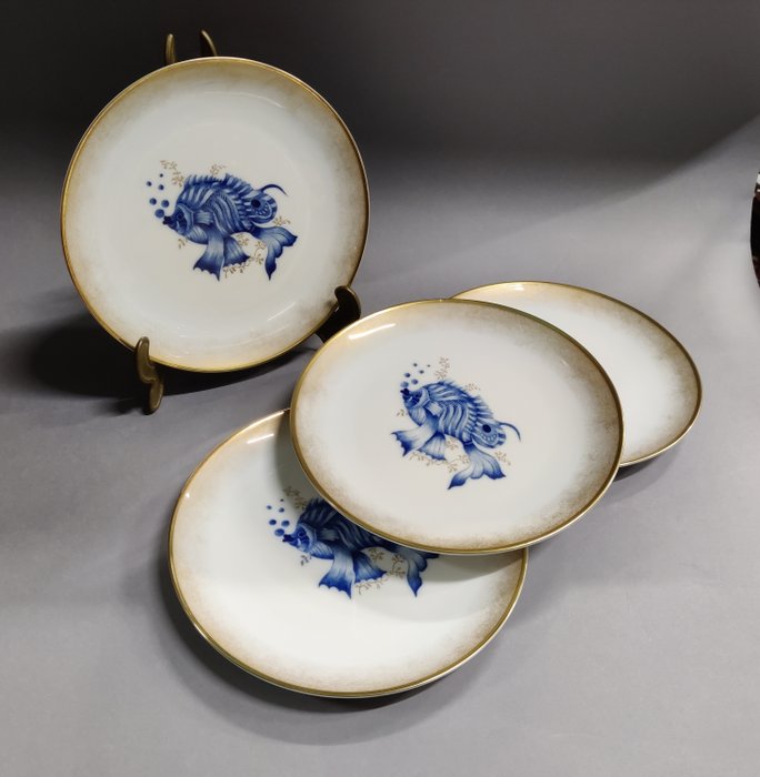 Visset bestaande uit een grote vissenkom, juskom en 11 borden met drie verschillende designs (3+4+4).