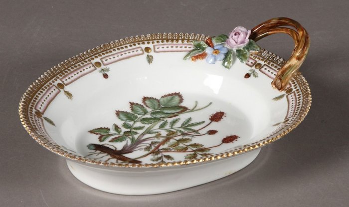 Koninklijk Kopenhagen. 'Flora Danica' porselein met gekartelde waaier, in kleuren gedecoreerd met Kväsurt, gemodelleerd met takken en poussed bloemen.