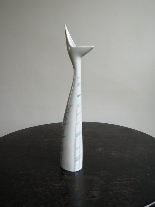 Doordat de slanke vaas eindigt in een soort gestileerde opengesperde vogelbek, doet deze sterk denken aan de Royal Dux ontwerpen van Jaroslav Ježek.
