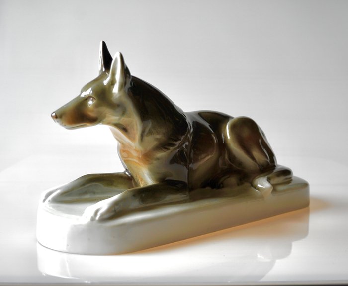 Zeer mooi en zeldzaam vintage Royal Dux porseleinen beeld van een Duitse jachthond. Het is de grote versie met een lengte van 29,5 cm. Handbeschilderd porselein, sterk geglazuurd, glanzende afwerking. Bohemen, Tsjechoslowakije, periode midden 20e eeuw.