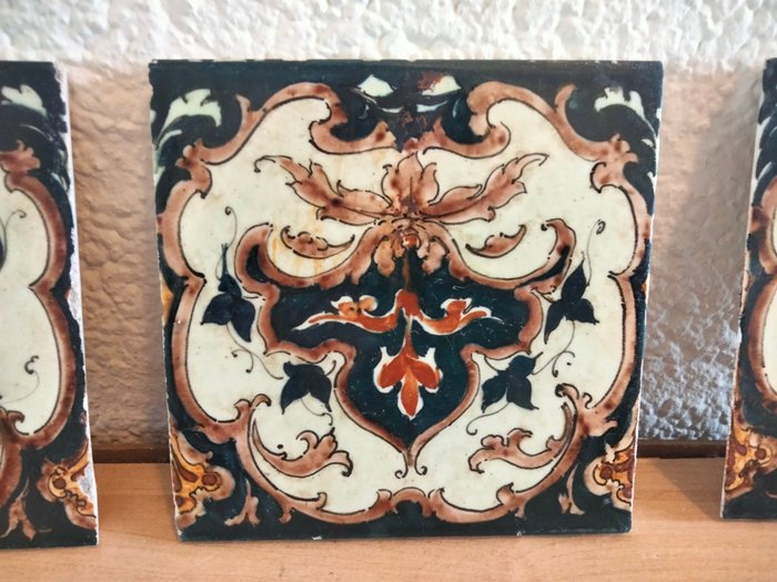 Florale tegels gemaakt bij de Rozenburg fabriek in Den Haag rond 1890 en beschilderd met bloemen.