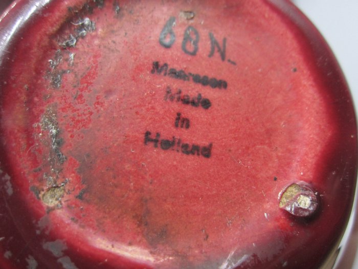3 prachtige dieprode vazen van 20/18/13,5 cm waarvan twee met zwarte decoraties in Art Nouveau stijl. De trechtervorm exact dezelfde kleur maar ongemerkt. De grootste van ca 20 cm met een pottenbakkersfout aan de voetrand!