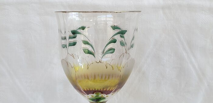 De prachtige geëmailleerde beschildering is ronduit schitterend, zeker wanneer je ook aan de binnenkant van het glas bekijkt. Het lijkt wel een gestileerde bloem.