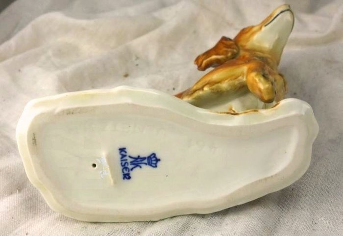 Teckel hond sculptuur in geschilderd en geglazuurd Duits porselein.