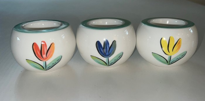 Prachtige set van 3 stuks Ulrica Hydman-Vallien "Tulipa" kandelaars ontwerp voor Zweedse Kosta Boda. Elke kandelaar is gesigneerd en heeft 2 tulpen in indigo, geel of rood.
