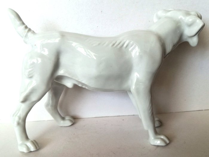 Hondensculptuur van de Unterweißbach Porzellanfabrik, Duitsland, ca.1960.nGlanzend geglazuurd wit porselein, gemaakt in Thüringen.nGemerkt op de borst (foto's 8-9-10)ncm. 11.5 uur x 17 x 6nIn zeer goede staat, zonder enige schade of restauratie.nUit een privé verzameling Duitse en Engelse porseleinen hondjes.nKoerier verzending.2023-01-30 09:31:16 2023-02-21 14:40:48